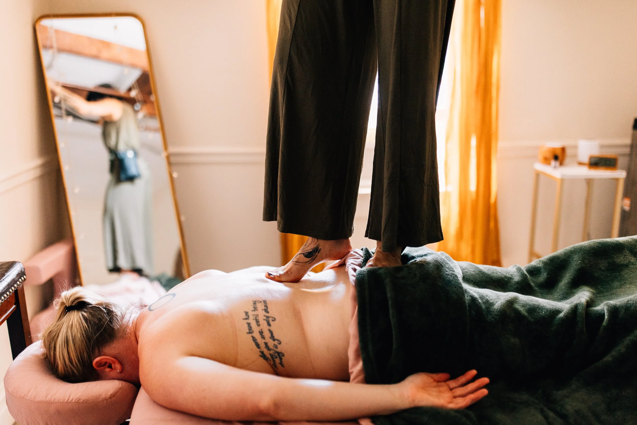 The type of massage therapy we specialize in is myofascial barefoot massage otherwise known as fasciashi. With myofascial massage, we use the least amount of lubricant possible in order to target the fascia. If you do happen to be wearing lotion, let your therapist know so that they can apply less oil.